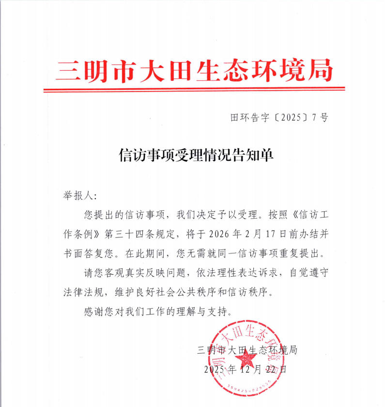 信访事项受理情况告知单(田环告字〔2025〕7号)