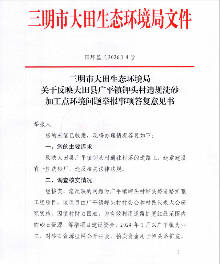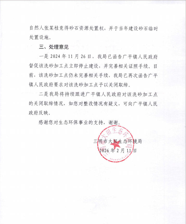 三明市大田生态环境局关于反映大田县广平镇钾头村违规洗砂加工点环境问题信访事项答复意见书(田环监〔2026〕4号)